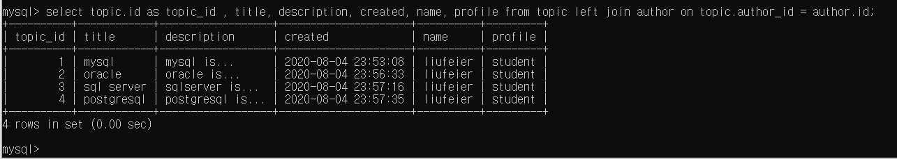select * from topic left join author on topic.author_id = author.id;