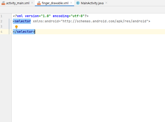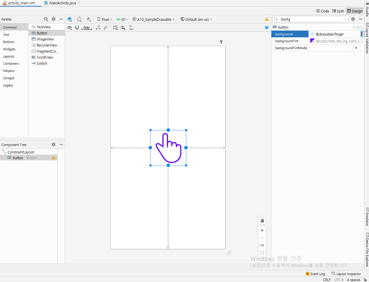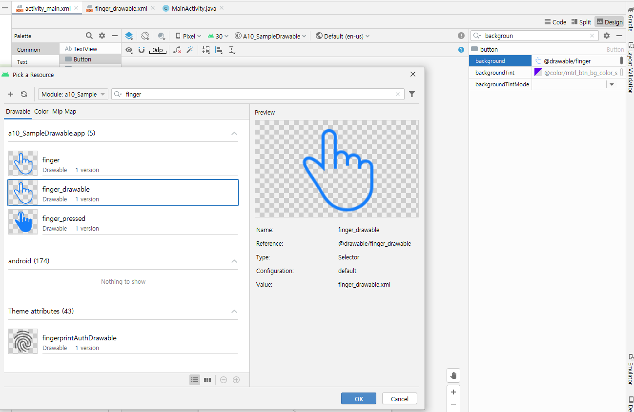 activity_main.xml에 만들어놓은 손 모양 버튼의 background 속성을 finger_drawable.xml으로 설정