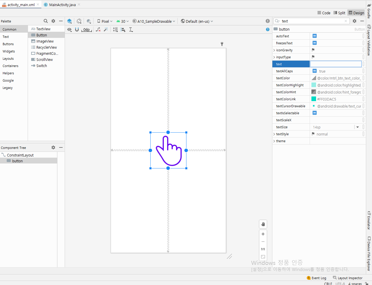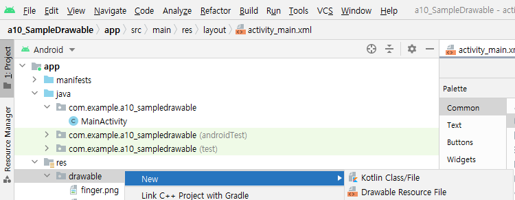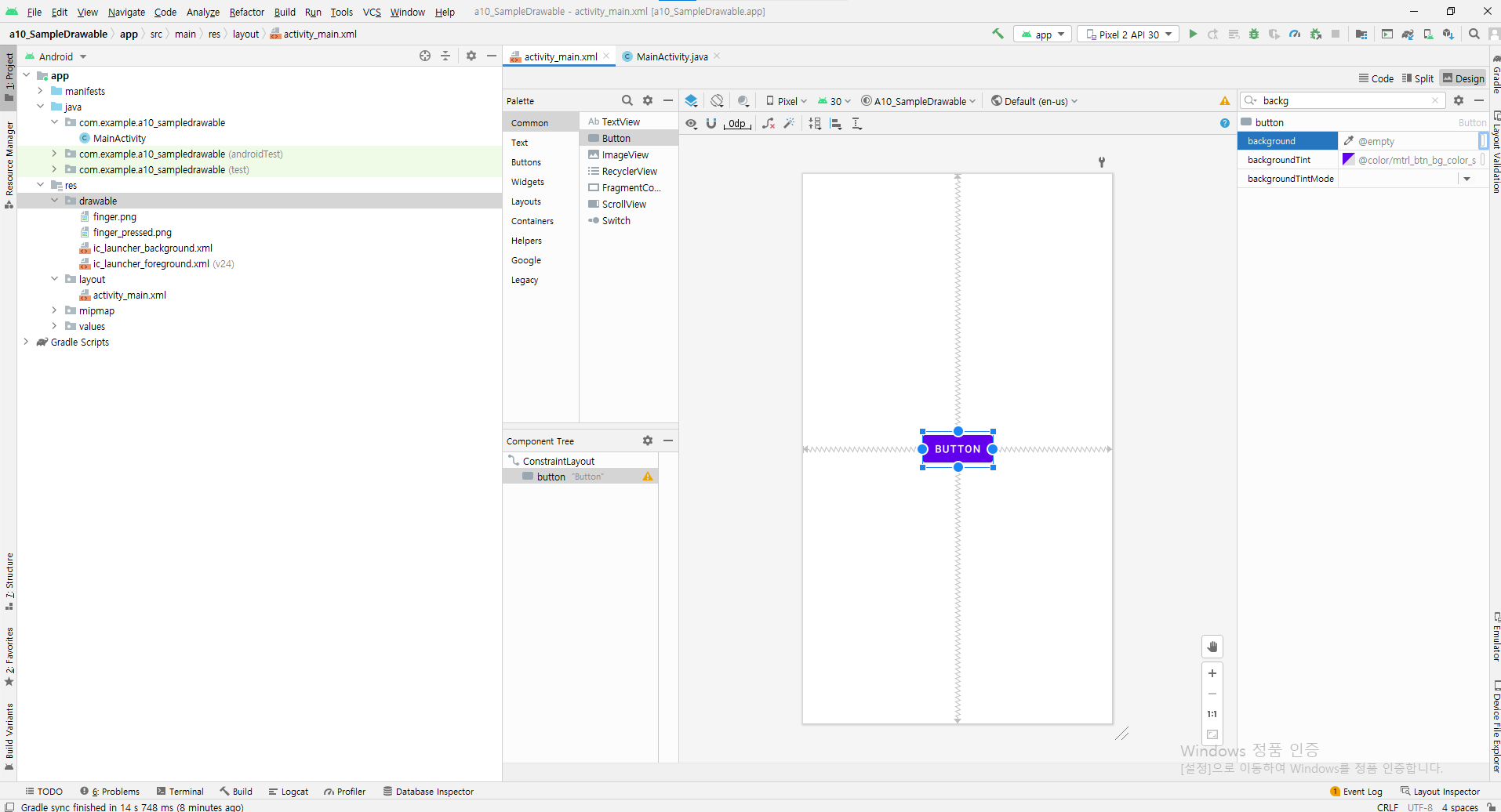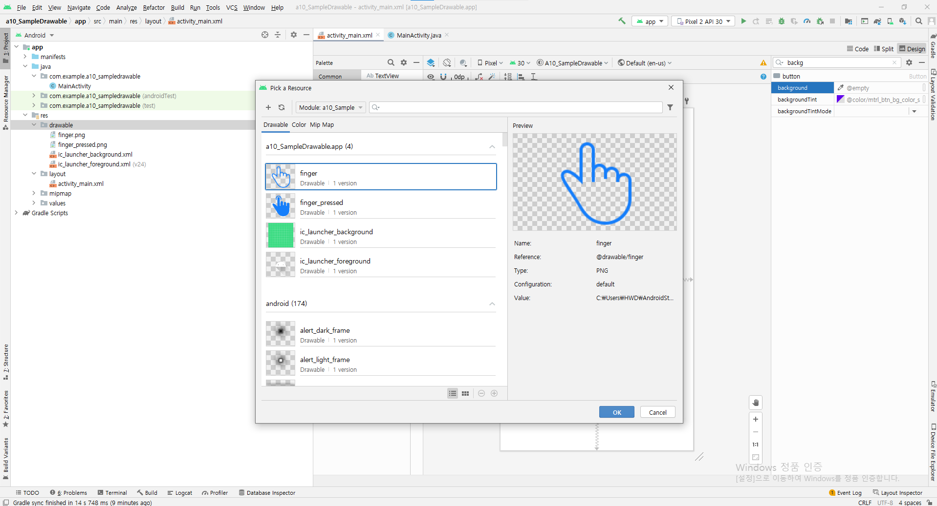 activity_main.xml에 만들어놓은 손 모양 버튼의 background 속성을 finger_drawable.xml으로 설정