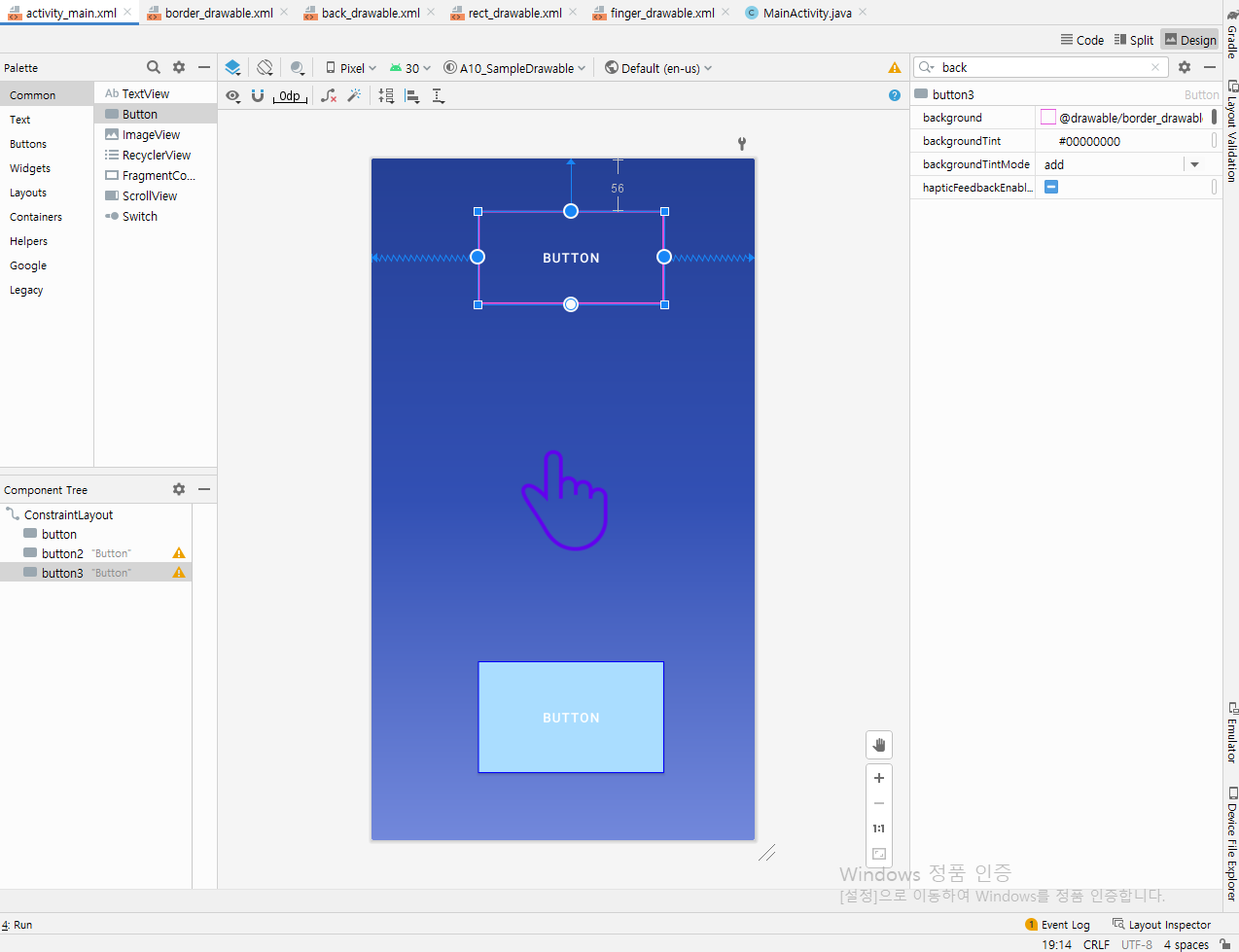 액티비티메인 xml에 버튼을 하나 추가하고 백그라운드를 border_drawable.xml로 설정, backgroundTint를 #00000000, backgroundTintMode를 add로 설정