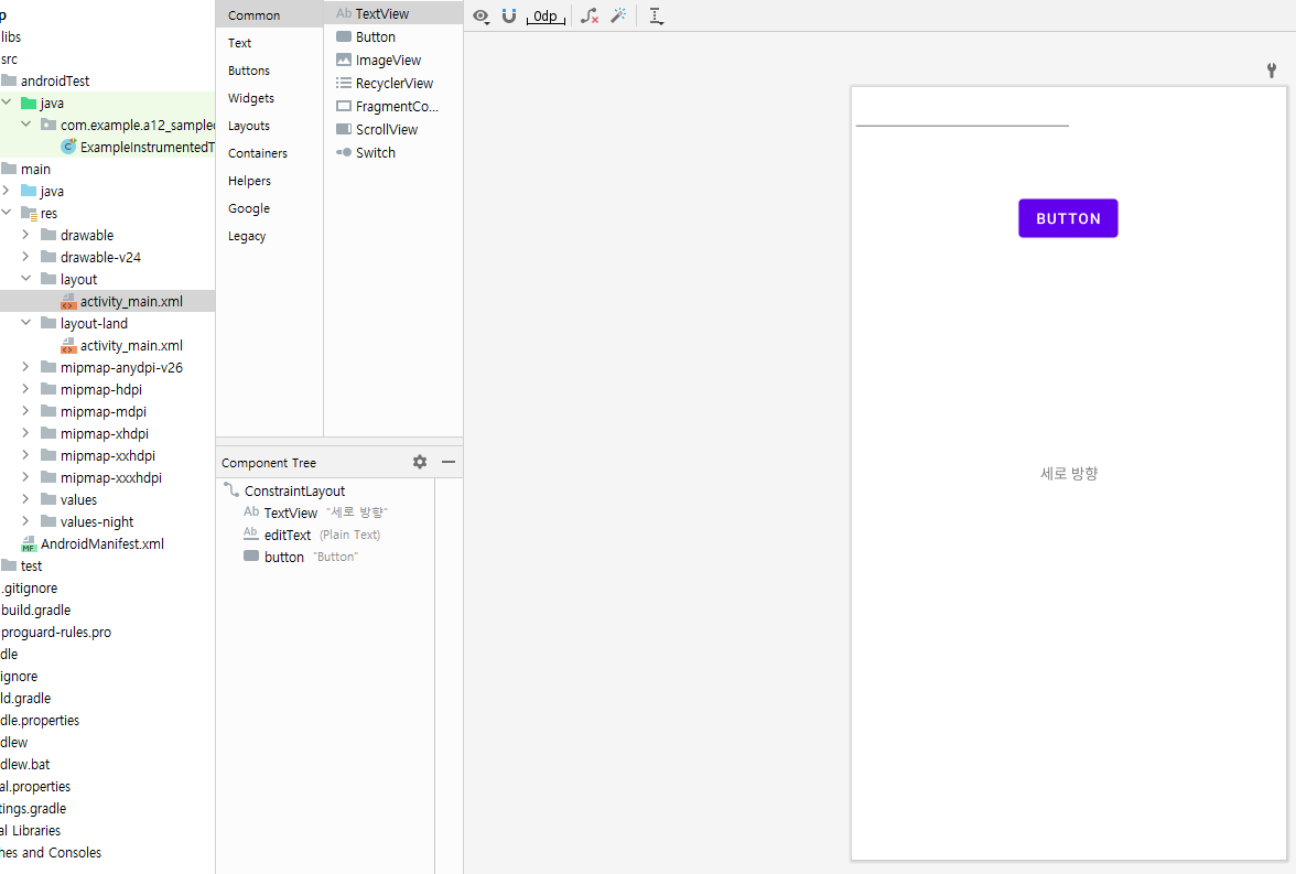액티비티메인에 플레인텍스트, 버튼을 추가. 플레인텍스트의 id를 정해주고, 액티비티메인 xml을 복사해서 layout-land로 붙여넣기한다