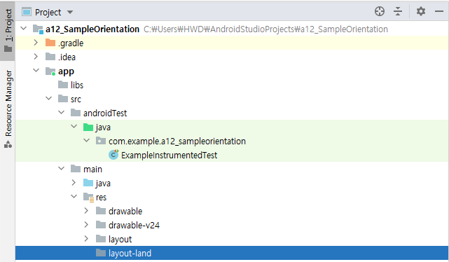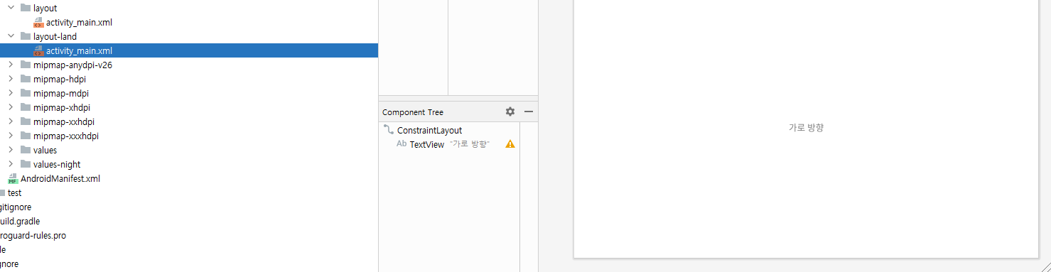 res 폴더 아래에 layout-land 새 폴더를 만듬, 새로 만든 폴더는 프로젝트를 표시해주기 위해선 좌측 상단의 프로젝트 탭을 안드로이드에서 프로젝트로 바꿔줘야함
