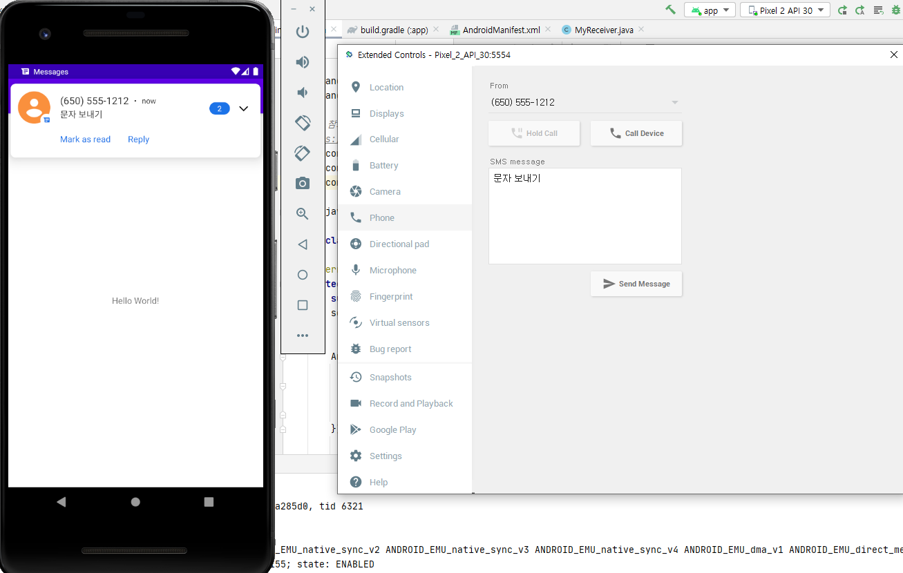 에뮬레이터 실행 후 [...] 클릭 - Phone 탭에서 가상으로 문자를 보낼 수 있다