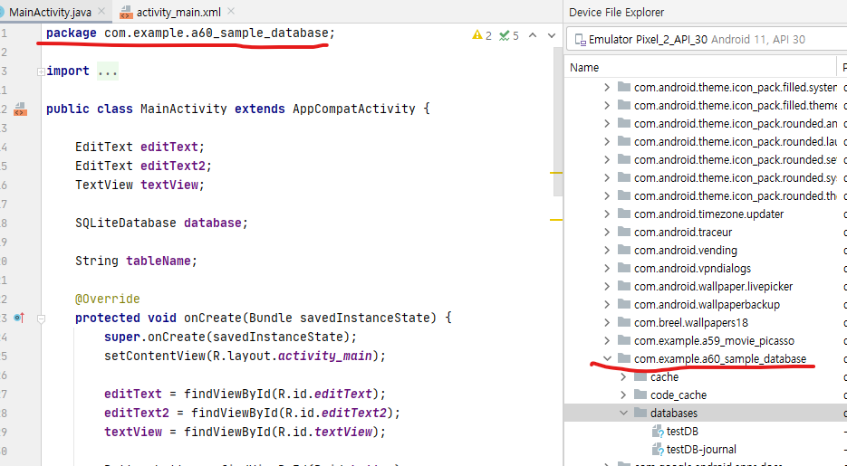 이 경로는 openOrCreateDatabase 메소드를 호출해서 만든 데이터베이스가 저장되는 곳이다
