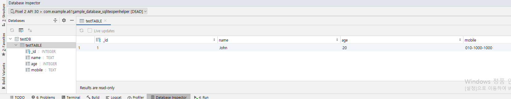 database.execSQL("insert into " + tableName + " (name, age, mobile) values ('John', 20, '010-1000-1000')");