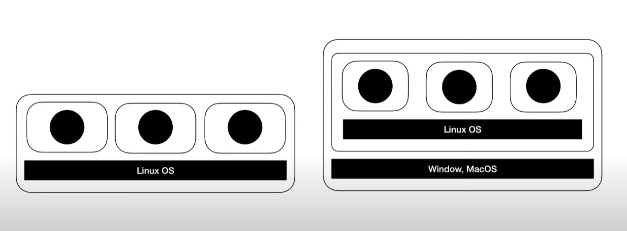 만약에 자신의 컴퓨터가 리눅스 운영체제가 아니라면, 윈도우나 맥에는 가상 머신을 깔고 그 가상 머신에 리눅스 운영체제를 깔면 리눅스 운영체제 위에서 도커와 같은 컨테이너 기술을 사용할수 있게 되는 것이다