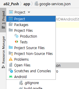 app 폴더 안에 google-services.json 파일 복사, 프로젝트 창이 Android일때는 모든 파일이 보이지 않으므로 Project로 변경하고 확인