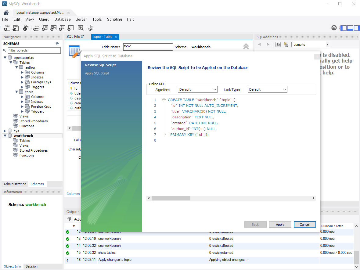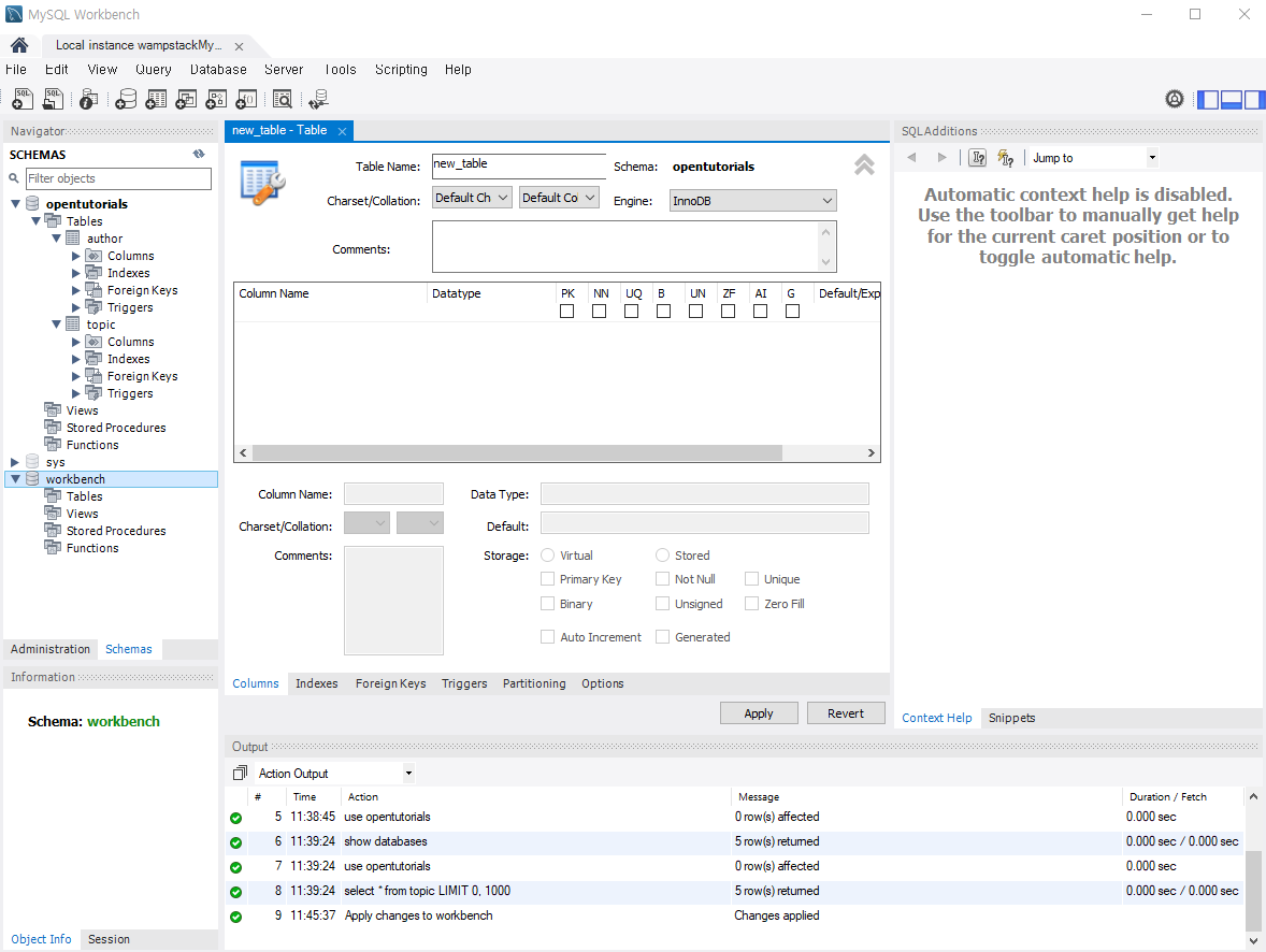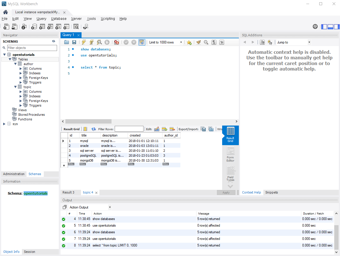 방금 만든 topic 테이블에 마우스를 근접시키고 3번째 아이콘 클릭