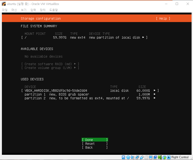 스토리지 설정 화면, 1기가는 부팅 환경이 사용