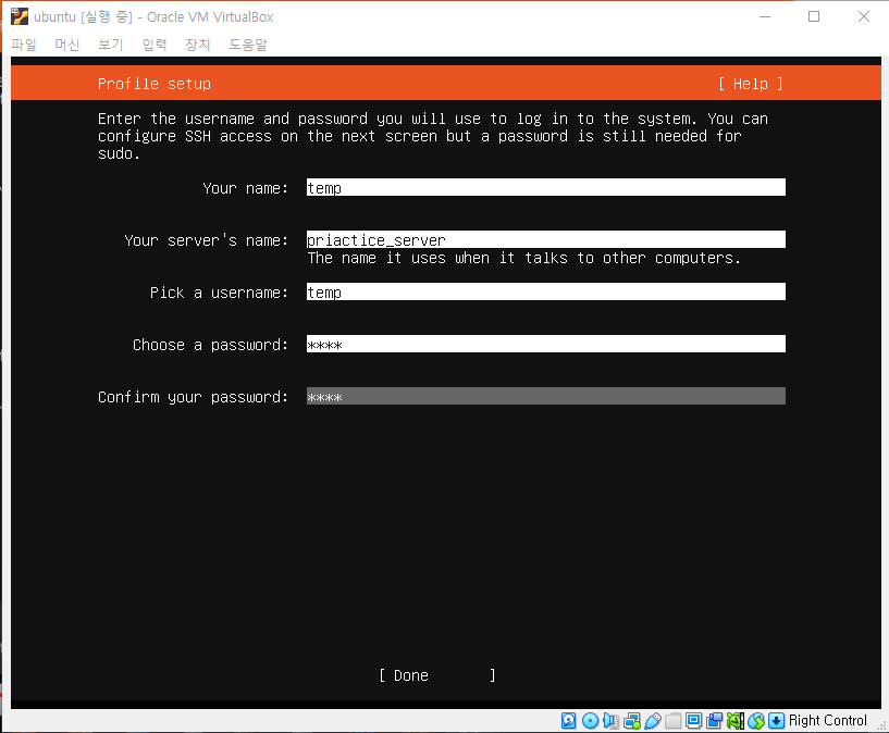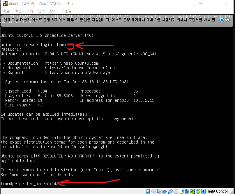 부팅이 완료되면 로그인 메세지가 뜨고, 프로필 설정 화면에서 정해준 username과 비밀번호로 로그인 하면 된다
