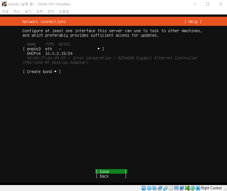 네트워크 설정 화면, 버츄얼박스가 10.0.2.15/24 ip를 부여받아서, 이 ip로 인터넷을 사용