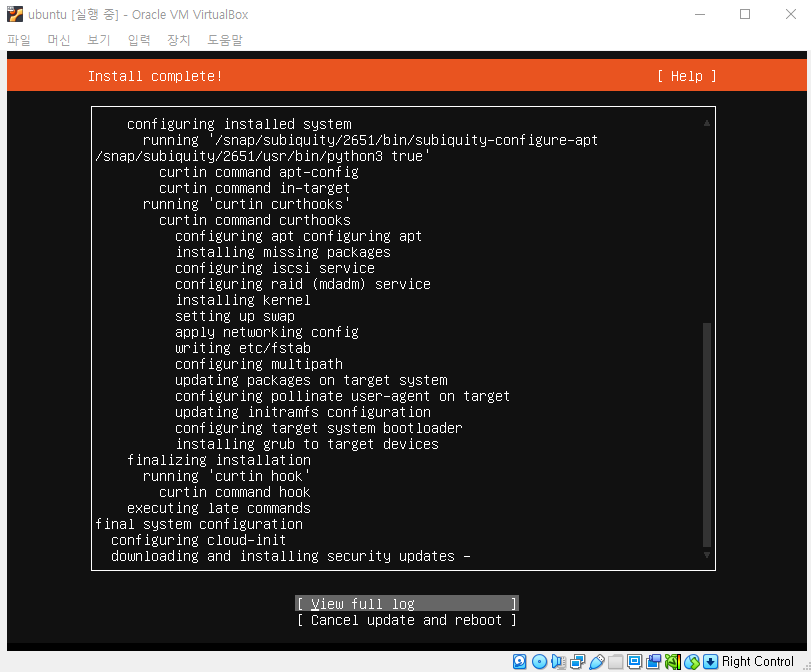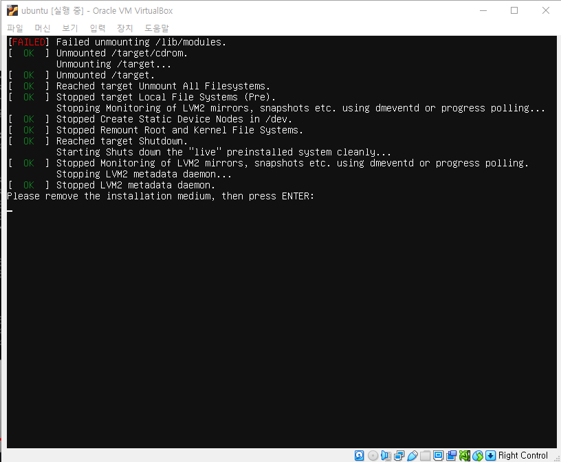 위에서 리붓 메세지가 떠서 리붓을 하려고 하면 이 화면이 뜨는데, failed는 신경쓰지 않아도 된다고 한다