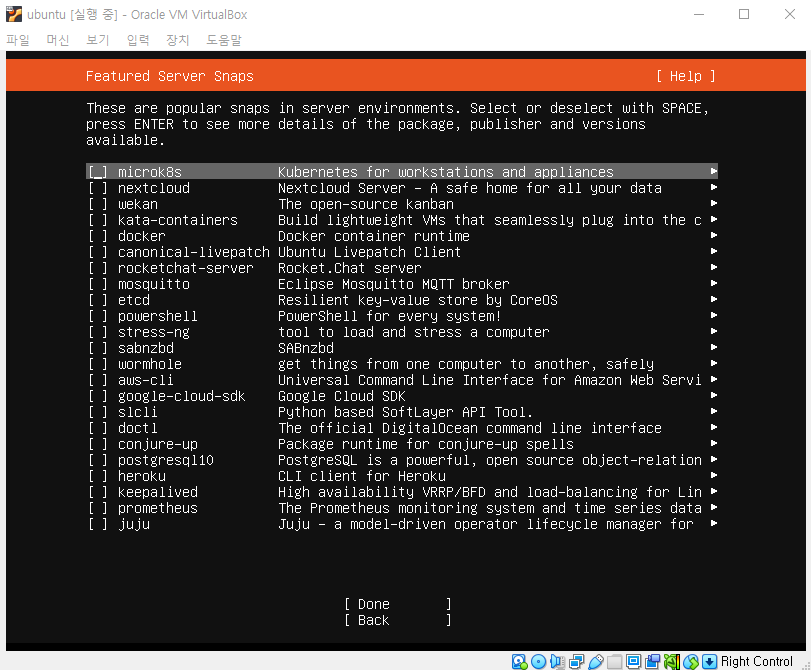 서버 스냅 설정 화면, 스냅이란 apt나 yum같이 프로그램을 설치하는 패키지 매니저라고 한다
