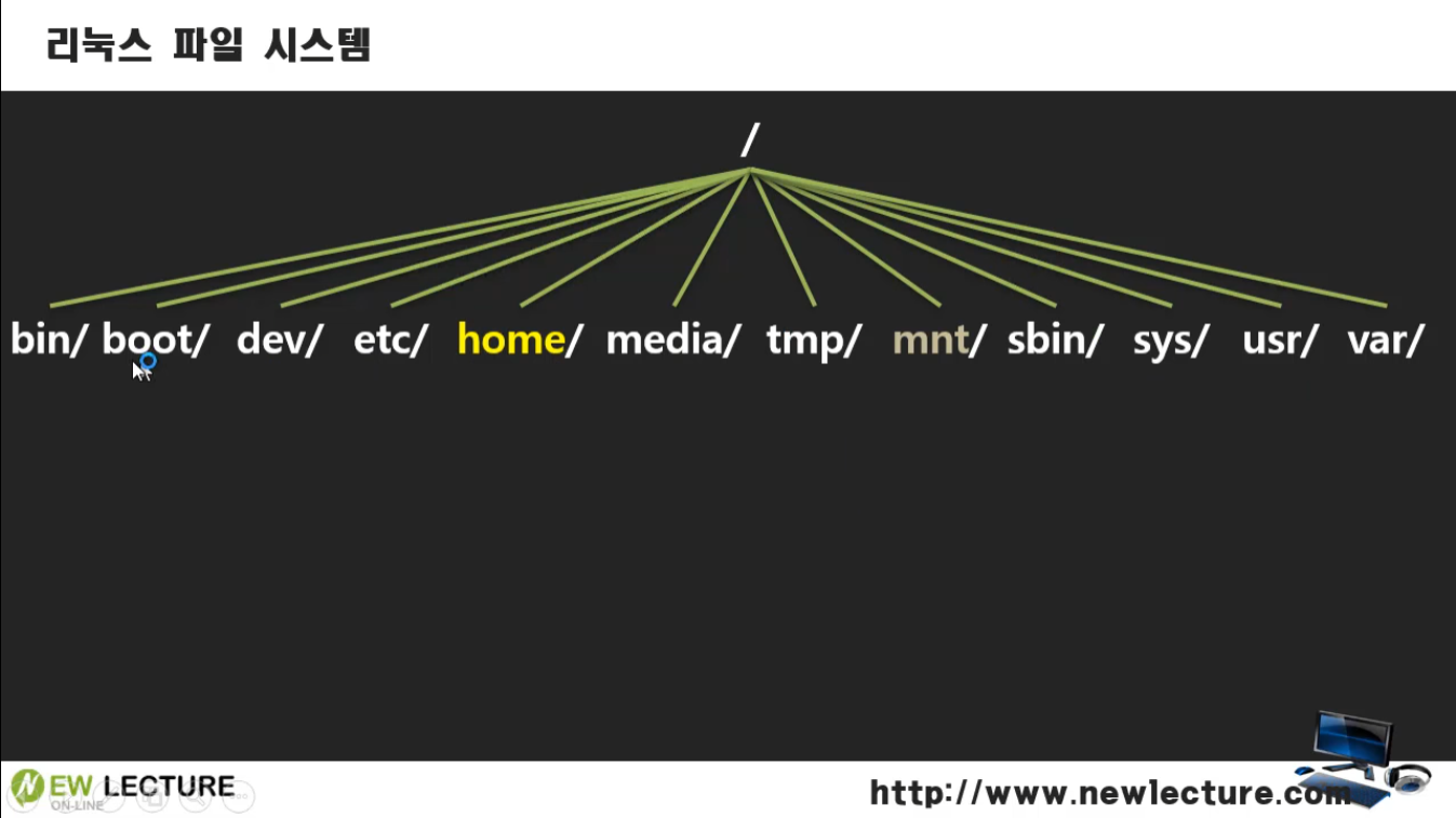 - 루트 디렉토리라고 불리며 리눅스의 최상위 디렉토리이다.
