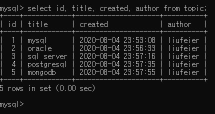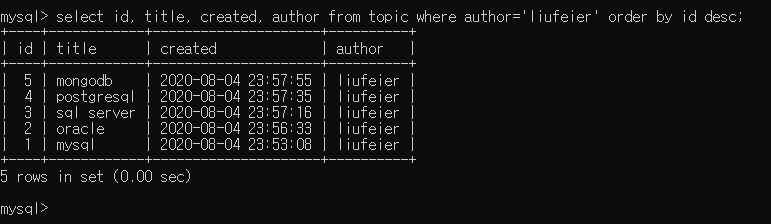 select id, title, created, author from topic where author='liufeier' order by id desc;