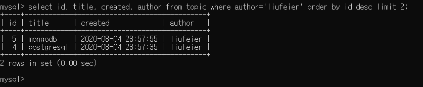 select id, title, created, author from topic where author='liufeier' order by id desc limit 2;