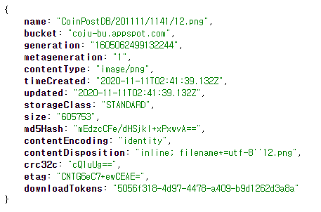 코딩 부분에서 downloadTokens을 따로 변수로 받아온 뒤에,